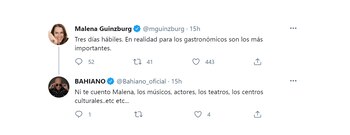 Malena Guinzburg destacó: “Tres días hábiles. En realidad para los gastronómicos son los más importantes” y el Bahiano le respondió: “Ni te cuento, los músicos, actores, los teatros, los centros culturales..etc etc...”. A lo que ella siguió el hilo: “Yo no puedo creer que cuando uno menciona eso, te dicen que no te importa que la gente muera. Me importa pero hay gente que hace dos años no puede laburar”.