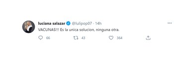 Luciana Salazar escribió: “Vacunas. Es la única solución, ninguna otra”. En el mismo sentido, Adrián Martínez, más conocido como el Dipy, también se refirió a la importancia de inmunizar, aunque su mensaje fue bastante más contundente: “Nos encerraste 9 meses. Prometiste vacunas para diciembre, fundiste a medio país, ustedes nunca dieron ejemplo. No se bajaron el sueldo. Se robaron las vacunas. Sacaste a todos los chorros amigos de cristina. Te cagaste en el pueblo. Chupala”.