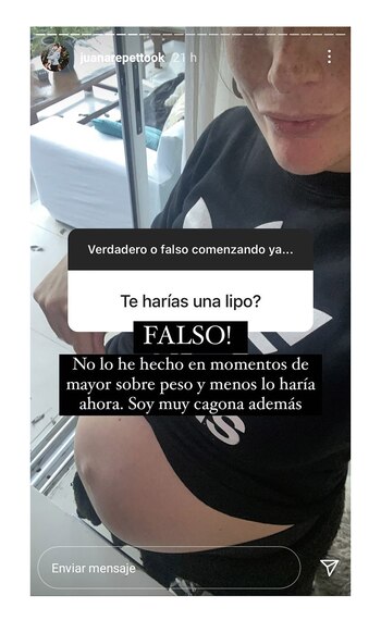 “¿Es verdad que Beli tendrá los dos apellidos?”, le consultó otra persona. “Verdadero”, contestó Juanita. Y desmintió que se haría una liposucción, una práctica quirúrgica que sirve para extraer tejido adiposo del cuerpo. “No lo he hecho en momentos de mayor sobrepeso y menos lo haría ahora. Soy re cagona”, afirmó con total sinceridad en la red social en la que tiene casi dos millones de seguidores.
