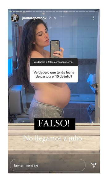 A través de sus historias de Instagram, la hija de Reina Reeech y Nicolás Repetto se animó a responder un verdadero o falso, con sus cientos de seguidores. “Verdadero que tenés fecha de parto para el 10 de julio”, le consultó un follower. La joven le respondió: “¡Falso! No llegamos a julio”. Además mostró una selfie de su panza que se sacó en el baño.