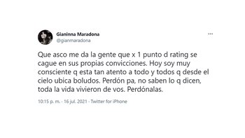 “Qué asco me da la gente que por 1 punto de rating se cague en sus propias convicciones. Hoy soy muy consciente que está tan atento a todo y todos que desde el cielo ubica boludos. Perdón pá, no saben lo que dicen, toda la vida vivieron de vos. Perdónalas” (sic), señaló la mamá de Benjamín Agüero en la red social. “Toda la vida fueron así, pero con vos sabían caretear la falta de amor. Nunca nos quisieron lamentablemente. Fuimos siempre las hijas de Claudia, no supieron separar que también éramos hijas tuyas”, finalizó.