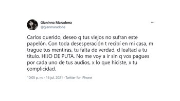 Gianinna vio la entrevista y escribió varios mensajes contra el especialista, furiosa por sus declaraciones: “Carlos querido, deseo que tus viejos no sufran este papelón. Con toda desesperación te recibí en mi casa, me tragué tus mentiras, tu falta de verdad, de lealtad a tu título. Hijo de puta. No me voy a ir sin que vos pagues por cada uno de tus audios, por lo que hiciste, por tu complicidad”.