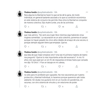 “Dijo Audre Lorde, una de las activistas que más admiro: ‘No seré una mujer libre mientras siga habiendo otras mujeres sometidas’. La vacunación es un acto colectivo, ponemos el cuerpo aunque no hayan pasado los cinco años ideales de ensayo de una vacuna, sí, porque siempre alguien tiene que empezar. ¿Qué es esa idea de que mejor empiece otro?”, preguntó la joven.