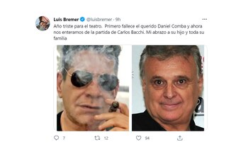 “Año triste para el teatro. Primero fallece el querido Daniel Comba y ahora nos enteramos de la partida de Carlos Bacchi. Mi abrazo a su hijo y toda su familia”, recordó el periodista Luis Bremer.
