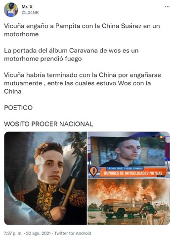 Aunque tanto Eugenia China Suárez como Benjamín Vicuña se encargaron de aclarar que su separación fue en buenos términos y sin infidelidades de por medio, al conocerse la noticia comenzaron a brotar los rumores que intentaron darle una explicación a esta ruptura. Y el que más rebote tuvo, al menos entre la audiencia de las redes sociales, fue aquel que ubica al rapero Valentín Oliva, más conocido por su alias Wos, como un supuesto “tercero en discordia”.