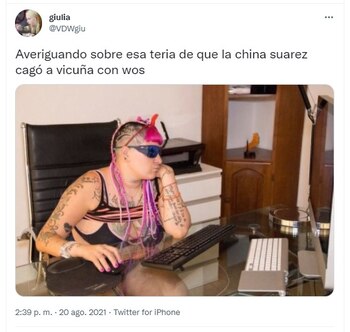 “No se la vincula a la China con Wos ahora. Fue en una etapa de conflicto que trajo que se separan en algún momento”, agregó la panelista. “¿Este es Wos? ¡Qué chico es Wos!”, apuntaron en la mesa, sorprendidos por la juventud del músico, uno de los artistas argentinos más escuchados por los fanáticos de las rimas. Pero más allá de la catarata de especulaciones, memes y bromas que desató el relato de Von Brocke, vale la pena rebobinar un poco la película para ver el acercamiento entre la actriz y el rapero.
