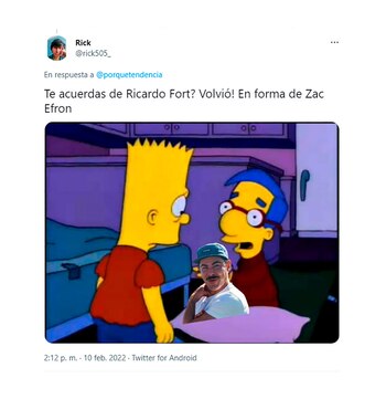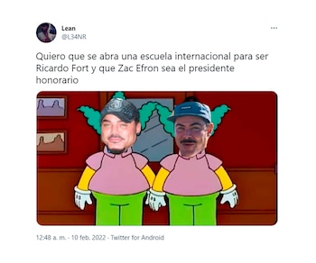 Pero también cosas del estilo: “No entendí si es Zac Efron o la reencarnación de Fort. O ambas”, “Zac Efron evolucionó en Ricardo Fort” y “Ricardo no se murió, Ricardo no se murió, Ricardo vive en Zac Efron la puta madre que lo parió” o también: “Todos Zac Efron, pero, ¿nadie se pregunta que hace al lado de Mike Amigorena?”, en referencia al supuesto parecido del hermano de Zac con el excéntrico actor argentino.
