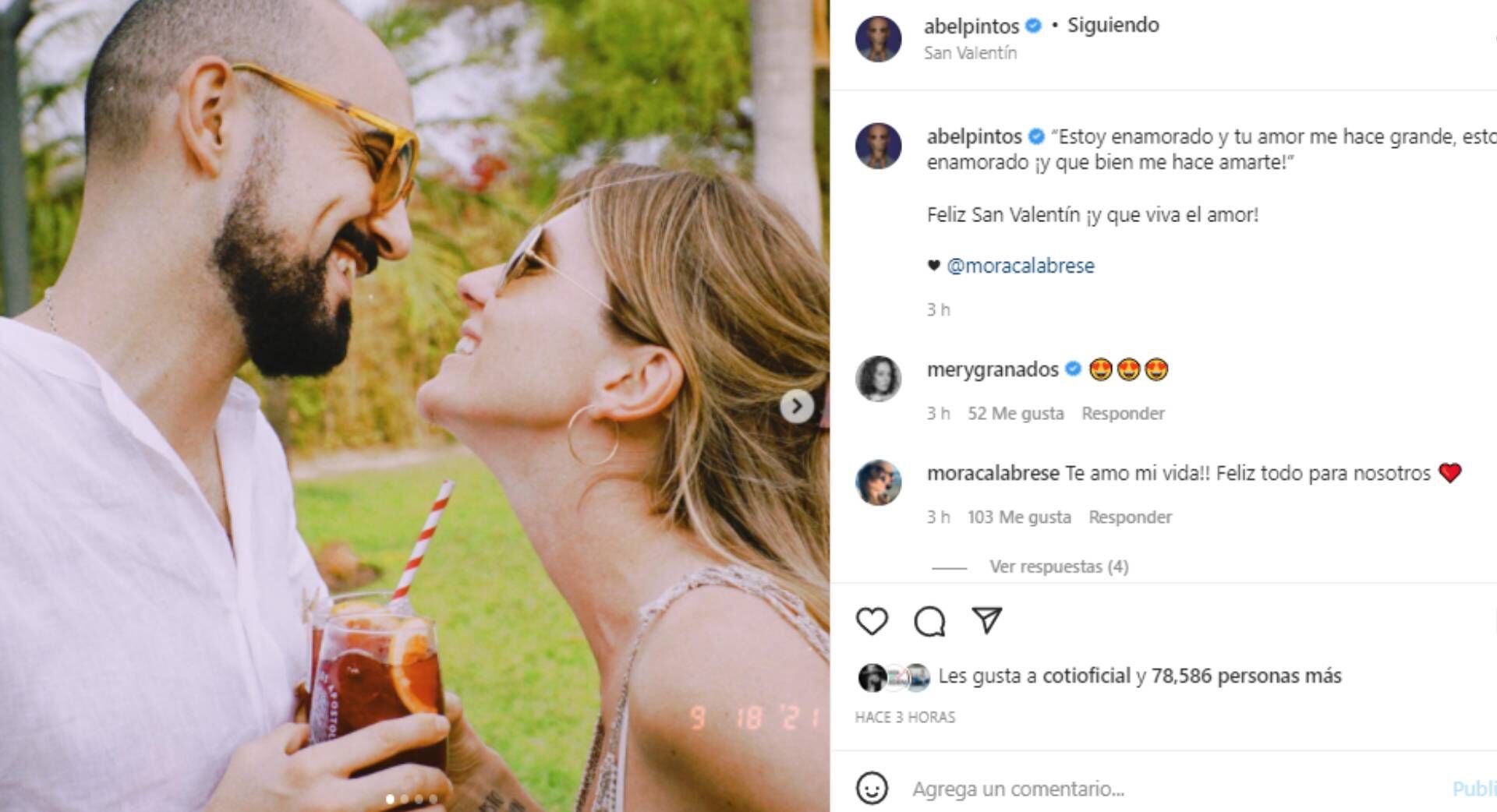 El cantante Abel Pintos también le dedicó unas cariñosas palabras a su esposa, Mora Calabrese. “Estoy enamorado y tu amor me hace grande, estoy enamorado ¡y que bien me hace amarte! Feliz San Valentín ¡y que viva el amor!”, manifestó el popular artista. La mamá de Agustín Pintos le respondió: “¡¡Te amo mi vida!! Feliz todo para nosotros”. Cabe recordar que la pareja celebró su casamiento el 25 de octubre con sus seres más íntimos en una quinta del partido bonaerense de Cañuelas, con Jairo como invitado de honor.