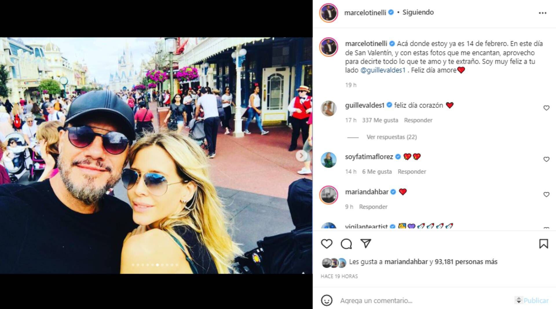 Marcelo Tinelli fue uno de los primeros en publicar un posteo en su cuenta oficial de Instagram, ya que se encuentra disfrutando de unas vacaciones con sus hijos en París, Francia. “Acá donde estoy ya es 14 de febrero. En este día de San Valentín, y con estas fotos que me encantan, aprovecho para decirte todo lo que te amo y te extraño. Soy muy feliz a tu lado. Feliz día, amore”, le escribió a Guille Valdés. La empresaria le respondió: “Feliz día, corazón”.