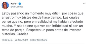 “Estoy pasando un momento muy difícil por cosas que arrastro muy tristes desde hace tiempo. Las cuales pensé que no, pero en realidad si me habían afectado mucho. Y nada tiene que ver con infidelidad ni con un tema de pareja. Respeten un poco antes de inventar historias. Gracias”, manifestó Karina. Además, señaló: “A la salud mental hay que respetarla”.