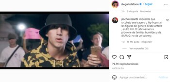 Ñako, uno de los amigos de Dieguito salió a defenderlo: “¿Y vos quien sos salchicha para definir de donde salen los artistas de cierto género? ¿Quién te dio el poder de definir eso? La música es universal y no distingue raza, color de piel o clases sociales. Es una manera de manifestarse y expresarse, ¿y por ser de cierta clase social no podés hacerlo según tu ‘argumento’? Dejalo al pibe tranquilo que hace lo que le gusta y no molesta a nadie, vos seguí gastando tu tiempo en repartir odio en Instagram que todo vuelve”. Dieguito le agradeció el comentario y señaló: “Atendiendo boludos”.