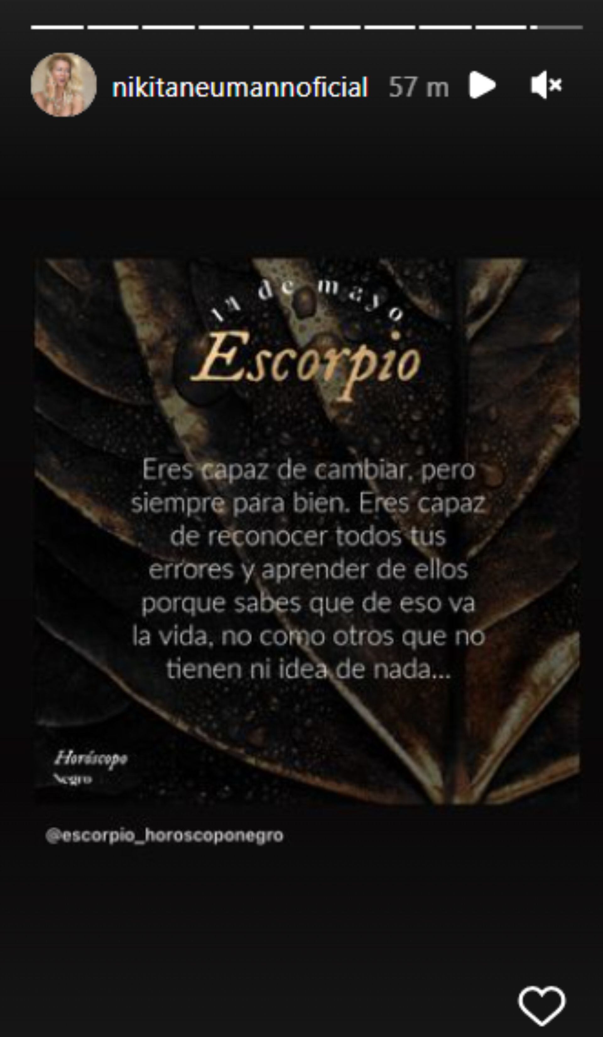 Por el momento, Neumann no hizo referencia a los dichos de Mica, en los que la acusaba de irresponsable, pero luego de ese video, dejó en sus stories una contundente frase sobre Escorpio, su signo zodiacal, que muchos tomaron como una indirecta hacia Viviconte. “Eres capaz de cambiar, pero siempre para bien. Eres capaz de reconocer todos tus errores y aprender de ellos porque sabes que de eso va la vida, no como otros que no tienen ni idea de nada”.