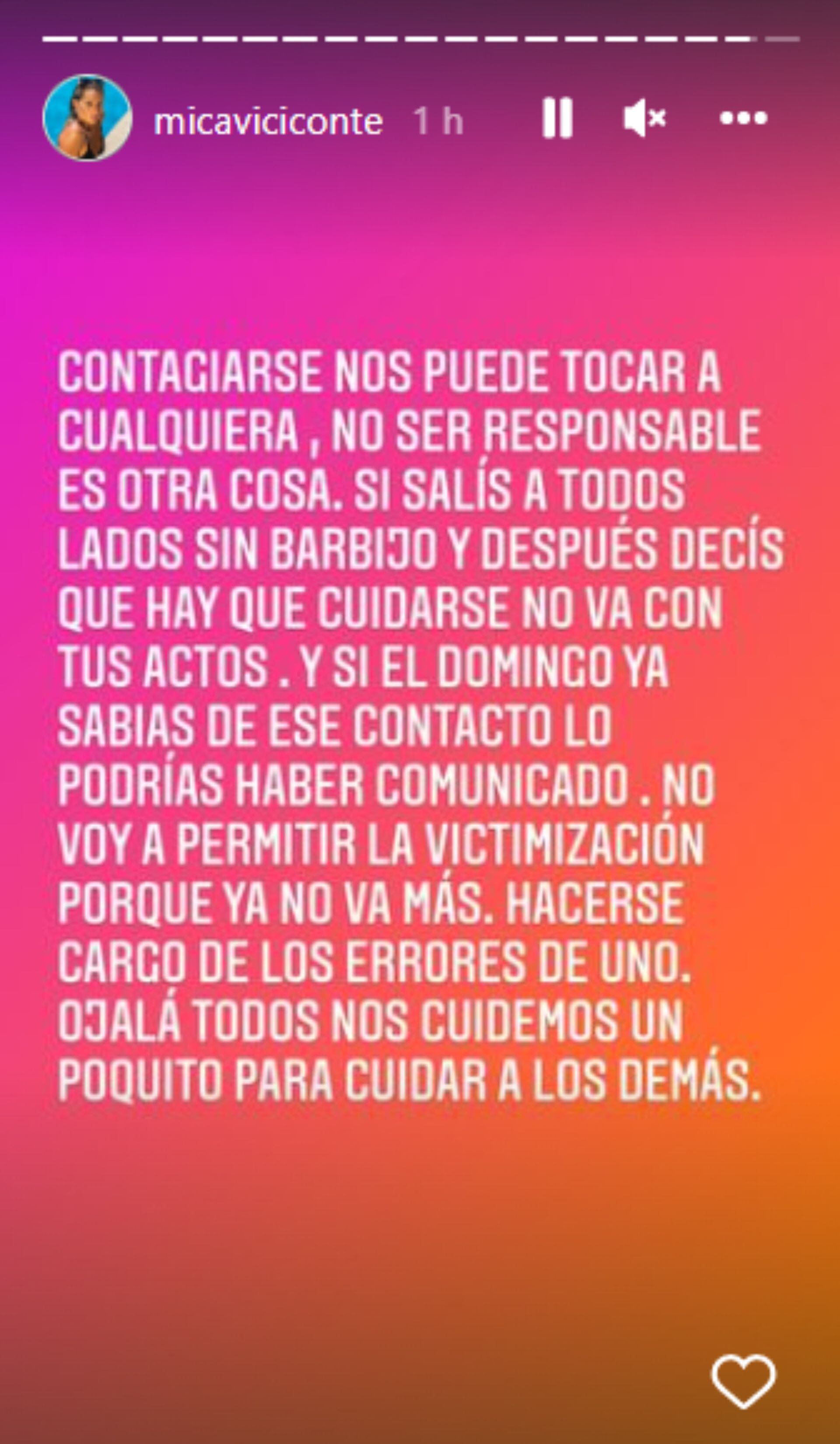 Minutos después de este descargo de Nicole, Mica volvió a utilizar sus redes sociales y apuntó directamente contra la mamá de Indiana, Allegra y Siena: “Contagiarse nos puede tocar a cualquiera, no ser responsable es otra cosa. Si salís a todos lados sin barbijo y después decís que hay que cuidarse, no va con tus actos. Y si el domingo ya sabías de ese contacto, lo podrías haber comunicado”. Y finalizó: “No voy a permitir la victimización porque ya no va más. Hacerse cargo de los errores de uno. Ojalá todos nos cuidemos un poquito para cuidar a los demás”.