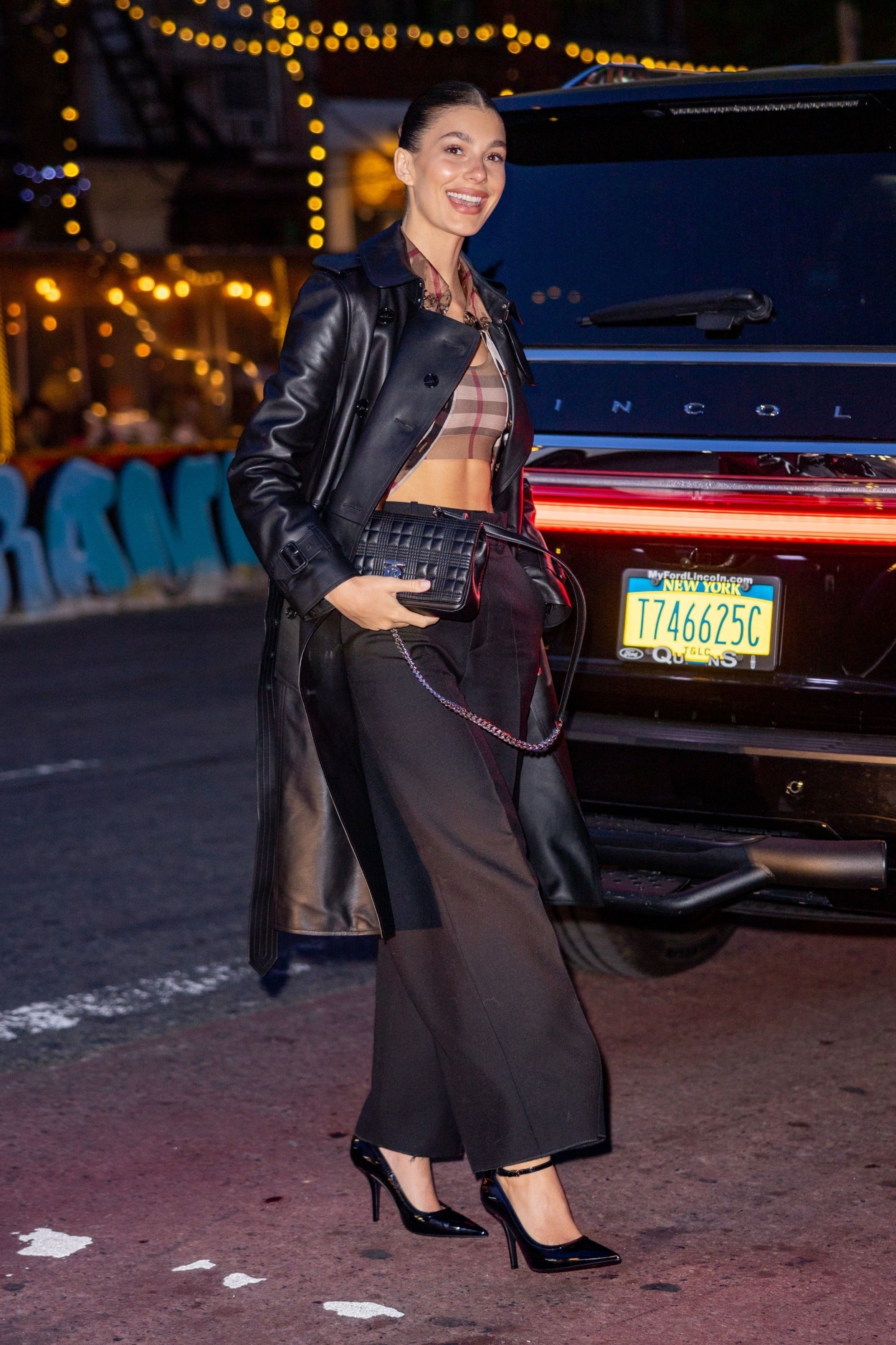 Camila Morrone asistió a un exclusivo evento de moda en Nueva York. La modelo, y novia de Leonardo DiCaprio, lució un pantalón negro de gabardina, un top de Burberry que hizo juego con la camisa que llevó desabrochada y un trench de cuero que combinó con su cartera y zapatos
