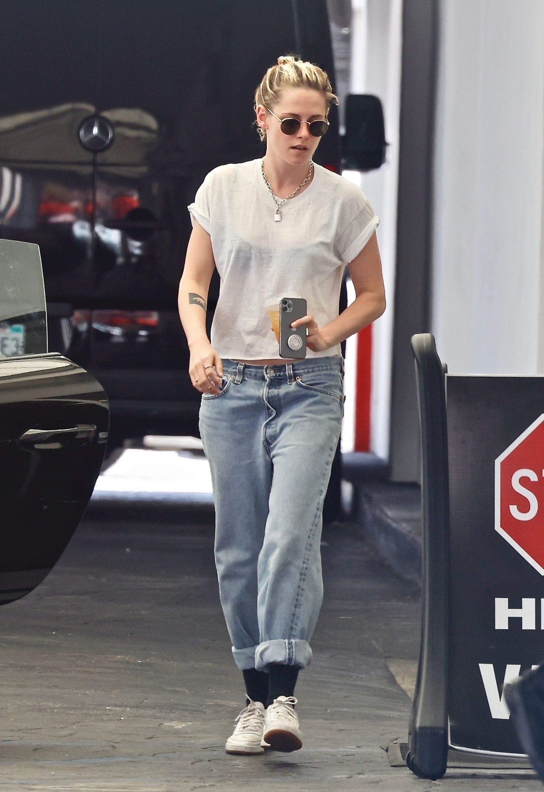Kristen Stewart fue fotografiada en el estacionamiento de un consultorio médico en Beverly Hills. La actriz intentó mantener bajo su perfil y siguió su camino sin hacer alusión a los fotógrafos presentes. Lucía un look casual de jean tiro bajo y remera blanca manga corta y llevaba un vaso de jugo y su celular