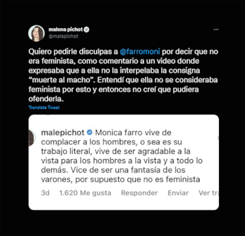 Ahora, Pichot decidió retroceder y le pidió disculpas a la vedette, quien también anunció que iniciaría acciones legales. “Quiero pedirle disculpas a Mónica por decir que no era feminista, como comentario a un video donde expresaba que a ella no la interpelaba la consigna ‘muerte al macho’. Entendí que ella no se consideraba feminista por esto y entonces no creí que pudiera ofenderla”, dijo en el primero de una serie de cuatro tweets.