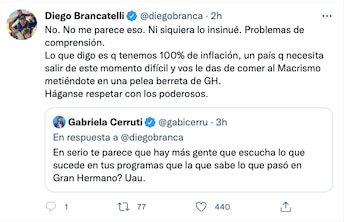 La portavoz le respondió en tono irónico: “¿En serio te parece que hay más gente que escucha lo que sucede en tus programas que la que sabe lo que pasó en Gran Hermano? Uau”. El periodista respondió: “No. No me parece eso. Ni siquiera lo insinué. Problemas de comprensión. Lo que digo es que tenemos 100% de inflación, un país que necesita salir de este momento difícil y vos le das de comer al macrismo metiéndote en una pelea berreta de GH. Háganse respetar con los poderosos”.
