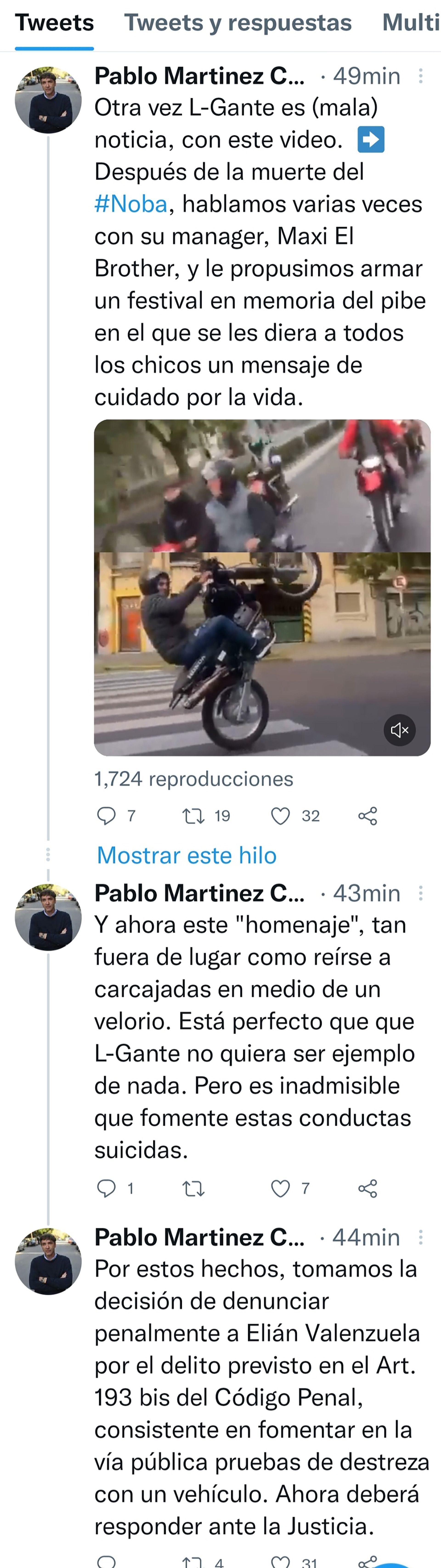 “Y ahora este ‘homenaje’, tan fuera de lugar como reírse a carcajadas en medio de un velorio. Está perfecto que L-Gante no quiera ser ejemplo de nada, pero es inadmisible que fomente estas conductas suicidas”, continuó diciendo en un hilo. Y terminó confirmando su determinación “Por estos hechos, tomamos la decisión de denunciar penalmente a Elián Valenzuela por el delito previsto en el Art. 193 bis del Código Penal, consistente en fomentar en la vía pública pruebas de destreza con un vehículo. Ahora deberá responder ante la Justicia”.