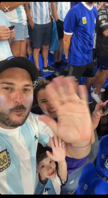 Diego Brancatelli, su esposa Cecilia Insinga y sus hijos también se mostraron en las gradas. Luego de haber superado el mal trago cuando chocaron con su auto, el periodista de Argenzuela realizó un vivo de Instagram desde las tribunas del estadio, con la camiseta albiceleste réplica de México ‘86. De fondo, se veía a Leo y sus compañeros realizar los ejercicios precompetitivos hasta que por cábala, ese sentimiento tan genuino como inexplicable, cortó la transmisión.