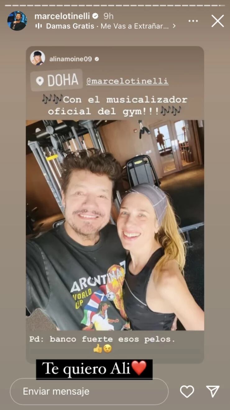 Tinelli republicó la story en su cuenta y le agregó un contundente mensaje: “Te quiero Ali”, junto con un corazón. Además, le agregó una canción romántica de Damas Gratis que lleva el rotundo título “Me vas a extrañar”.