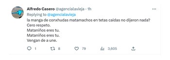 Y continuó: “¿La manga de conxhudas matamachos en tetas caídas no dijeron nada? Cero respeto. Mataniños eres tu. Mataniños eres tu. Vengan de a une”.