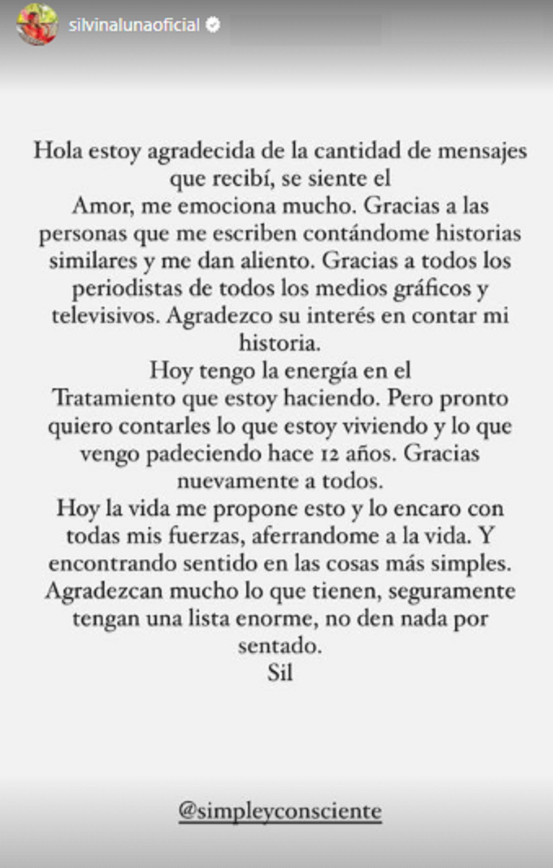 “Hola, estoy agradecida de la cantidad de mensajes que recibí, se siente el amor, me emociona mucho. Gracias a las personas que me escriben contándome historias similares y me dan aliento. Gracias a todos los periodistas de todos los medio gráficos y televisivos. Agradezco su interés en contar mi historia. Hoy tengo la energía en el tratamiento que estoy haciendo”, escribió la modelo.