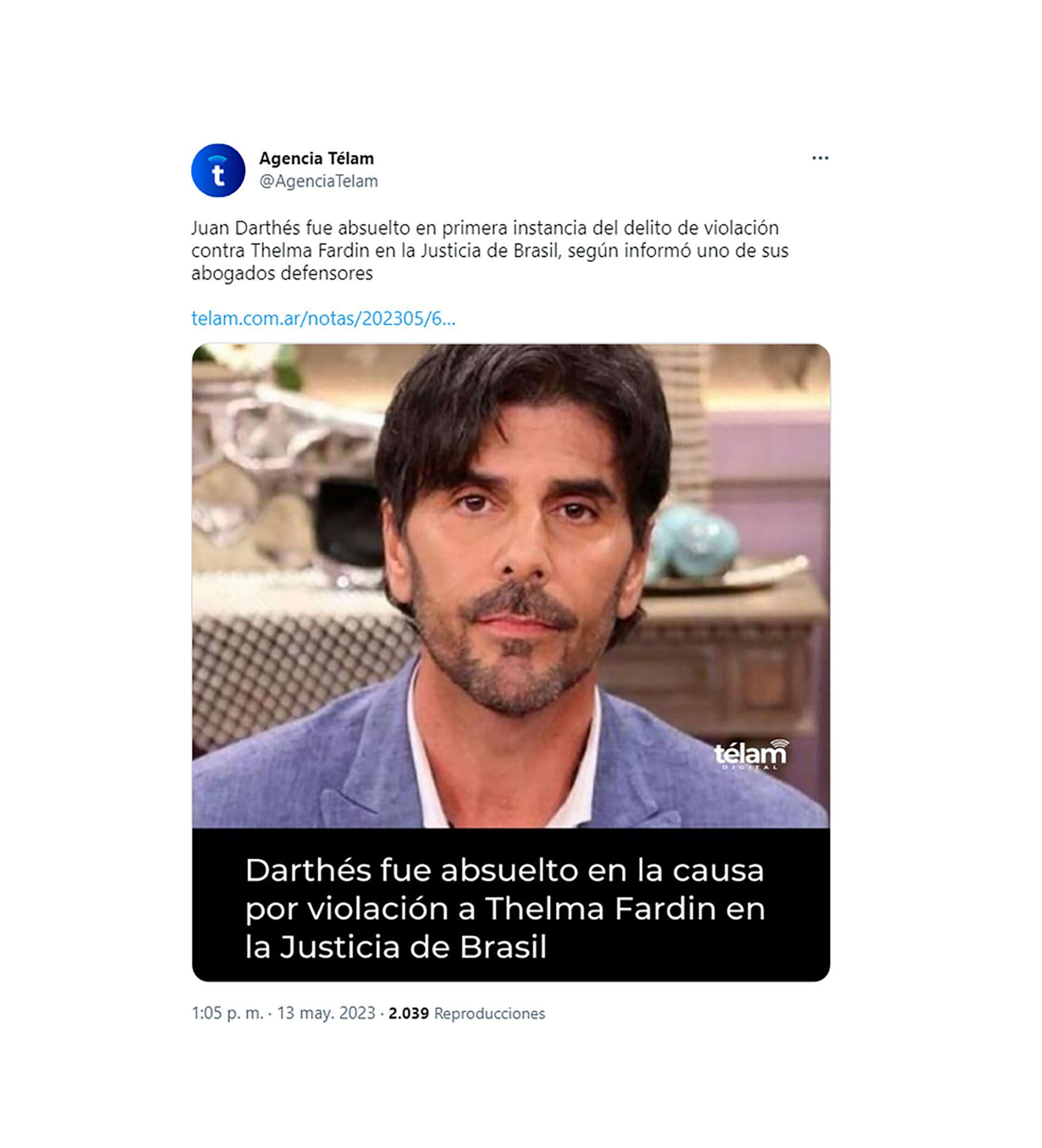 Juan Darthés fue absuelto por falta de pruebas por la Justicia brasilera en la causa por abuso sexual iniciada por Thelma Fardín, por un hecho que supuestamente habría ocurrido cuando la actriz participaba de la tira Patito Feo y había ido de gira junto a él a Nicaragua. La causa se presentó hace cuatro años y terminó en los tribunales de San Pablo, adonde se radicó el acusado.