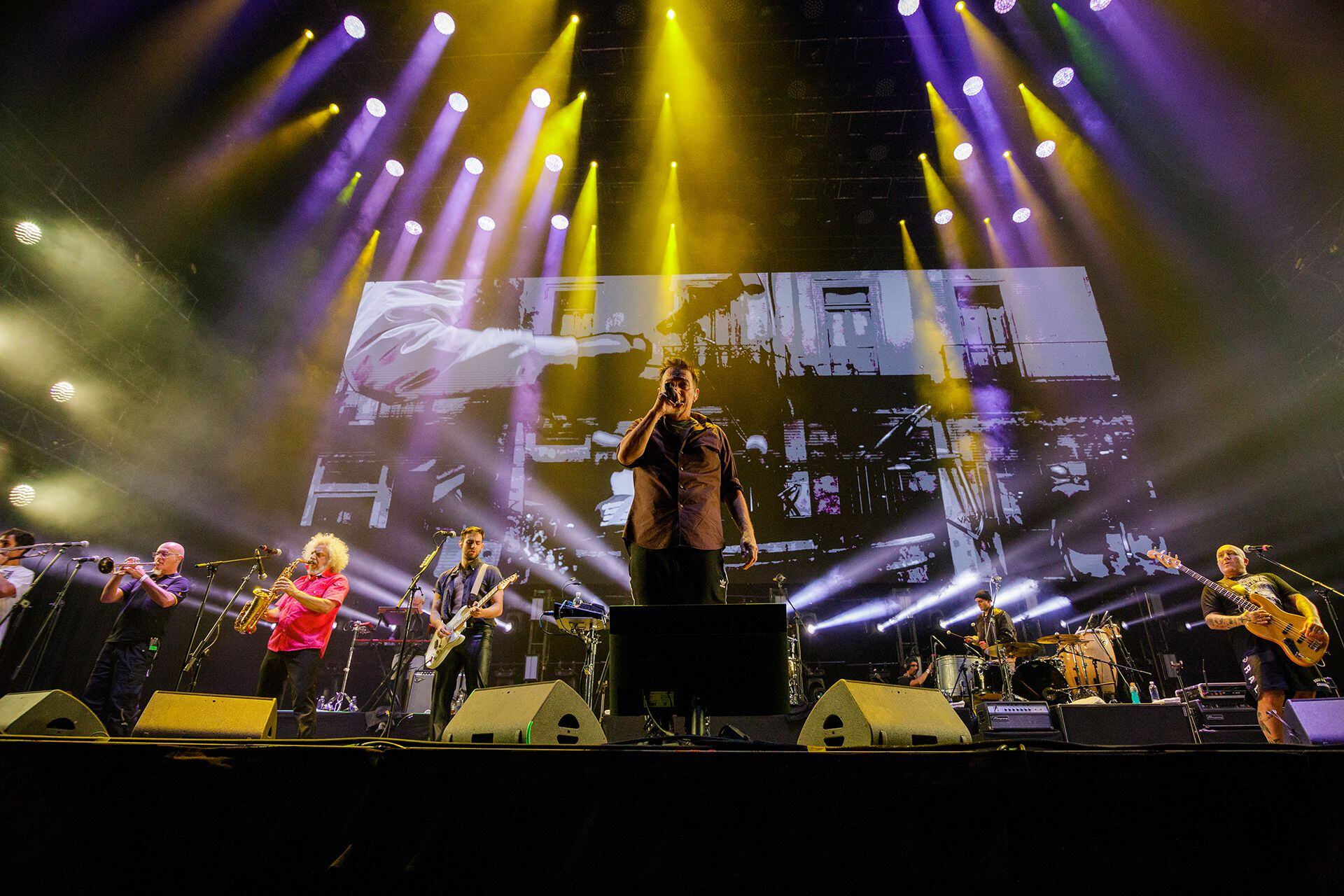 “FAMILIA”, se lee en el bíceps derecho de Florián Fernández Capello y la palabra se hinchó cuando con su guitarra pulsó con fuerza el motivo ska de la oldie-but-goldie “Estoy harto de verte con otros”. El tatuaje resume esta versión 3.0 de Los Fabulosos Cadillacs, que desde el 2008 es la banda que siempre está volviendo y que hay que aprovechar a ver cada vez que dan la cara: el último show en Buenos Aires había sido en 2018 y tanto el guitarrista como Astor Cianciarulo -hijos de Vicentico y Sr. Flavio, respectivamente- ya venían ganando rodaje como miembros estables.