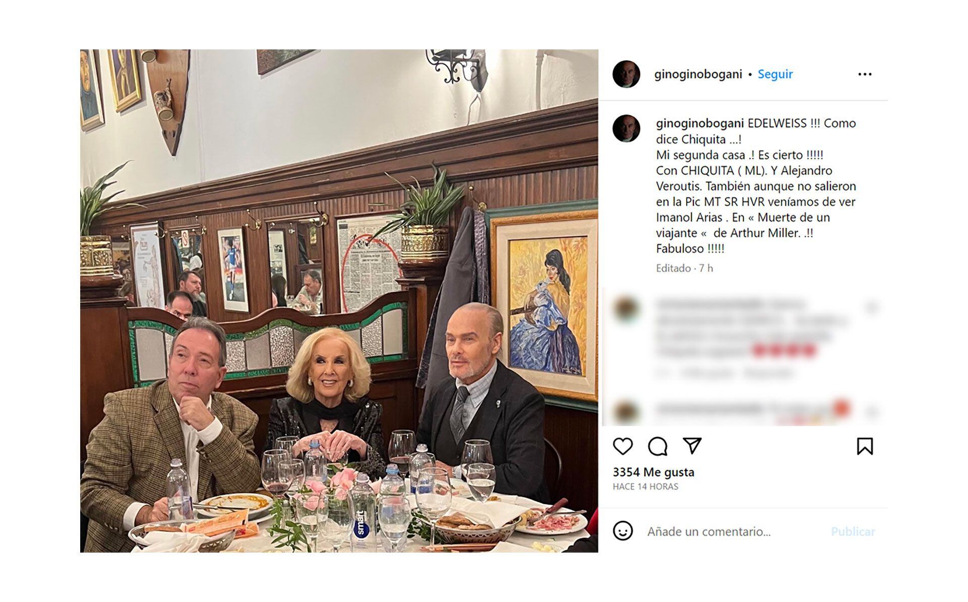 “¡Edelweiss! Como dice Chiquita, mi segunda casa. ¡Es cierto!”, escribió Bogani en su cuenta de Instagram junto a una foto en la que se lo veía junto a la diva y a Veroutis. Y, después de mencionar a los otros comensales que se encontraban en su mesa, hizo referencia a la obra de Arthur Miller que habían ido a ver con el protagónico de Imanol y lo calificó de: “¡Fabuloso!”.