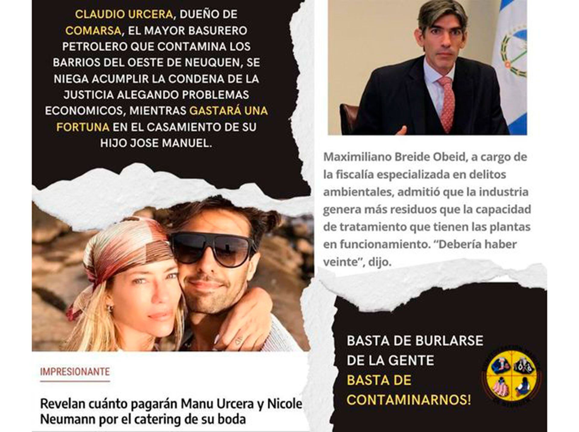 El texto asegura que la fiesta va a ser un regalo del suegro de la modelo, Claudio Urcera, a quien esta comunidad responsabiliza por daño ambiental. “¿La fiesta del año o la burla del año?”, tituló la organización el comunicado que comienza de la siguiente manera y apunta contra el señor Urcera que sería el dueño la Compañía de Saneamiento y Recuperación de Materiales S.A. (Comarsa). “Esta empresa es fuente de contaminación de las más graves de la Patagonia, ya que el Basurero Petrolero está instalado a pocos metros de populosos barrios del oeste de Neuquén”, sostienen.