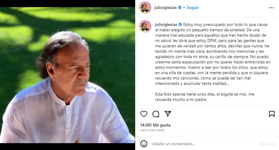 El artista comenzó su descargo explicando el enojo que le producían las distintas versiones, para luego terminar con los rumores y detallar su estado actual: “Estoy muy preocupado por todo lo que causa el haber elegido un pequeño tiempo de soledad. De una manera mal educada para aquellos que han hecho dudar de mi salud, les diría que estoy DPM, pero para la gente que me quiere de verdad por tantos años, decirles que nunca he tenido mi mente más clara, escribiendo mis memorias y les agradezco con toda mi alma, su cariño de siempre”.