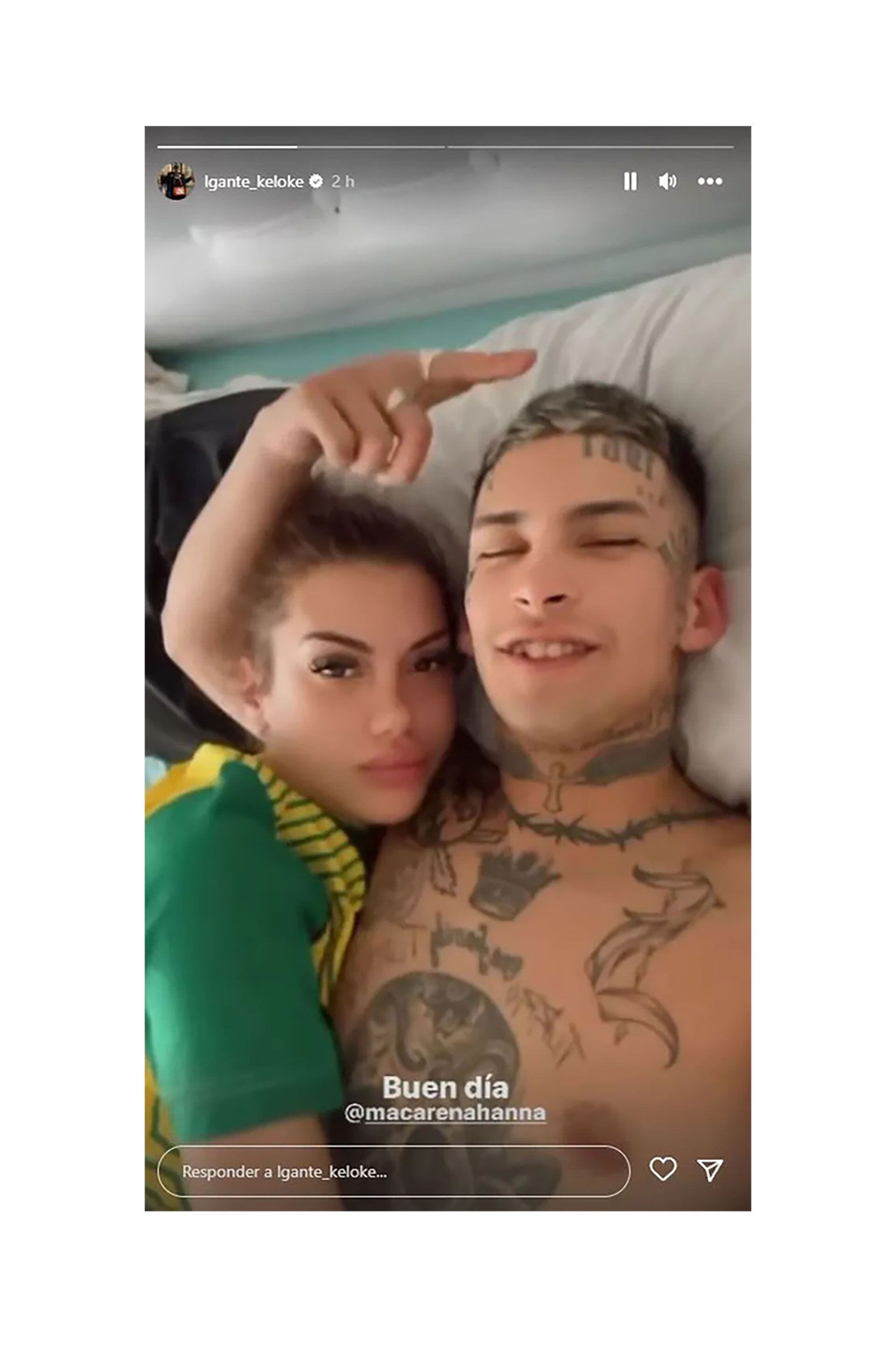 Pero, lo dicho, L-Gante no se quedó atrás y blanqueó su nueva relación horas después de que Tamara hiciera lo propio. “Buen día”, escribió en el boomerang de Instagram que compartió cuando ya eran las tres de la tarde y se lo veía recostado en su cama abrazado a una chica. Su nombre, Macarena Hanna Bustamante, según como la mencionó en la publicación que subió a sus historias.