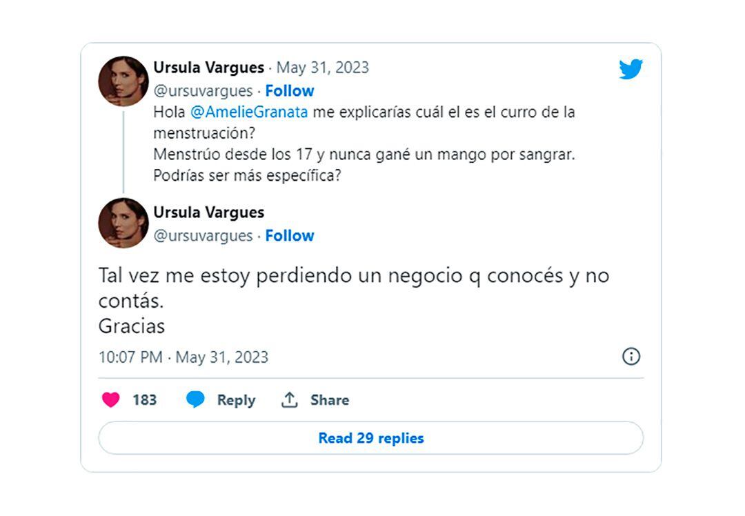 Sus declaraciones generaron revuelo en las redes sociales y Úrsula Vargues decidió confrontar a la diputada provincial. La periodista escribió en su cuenta oficial de Twitter: “Hola, Amalia. ¿Me explicarías cuál es el curro de la menstruación? Menstrúo desde los 17 y nunca gané un mango por sangrar. ¿Podrías ser más específica?”.