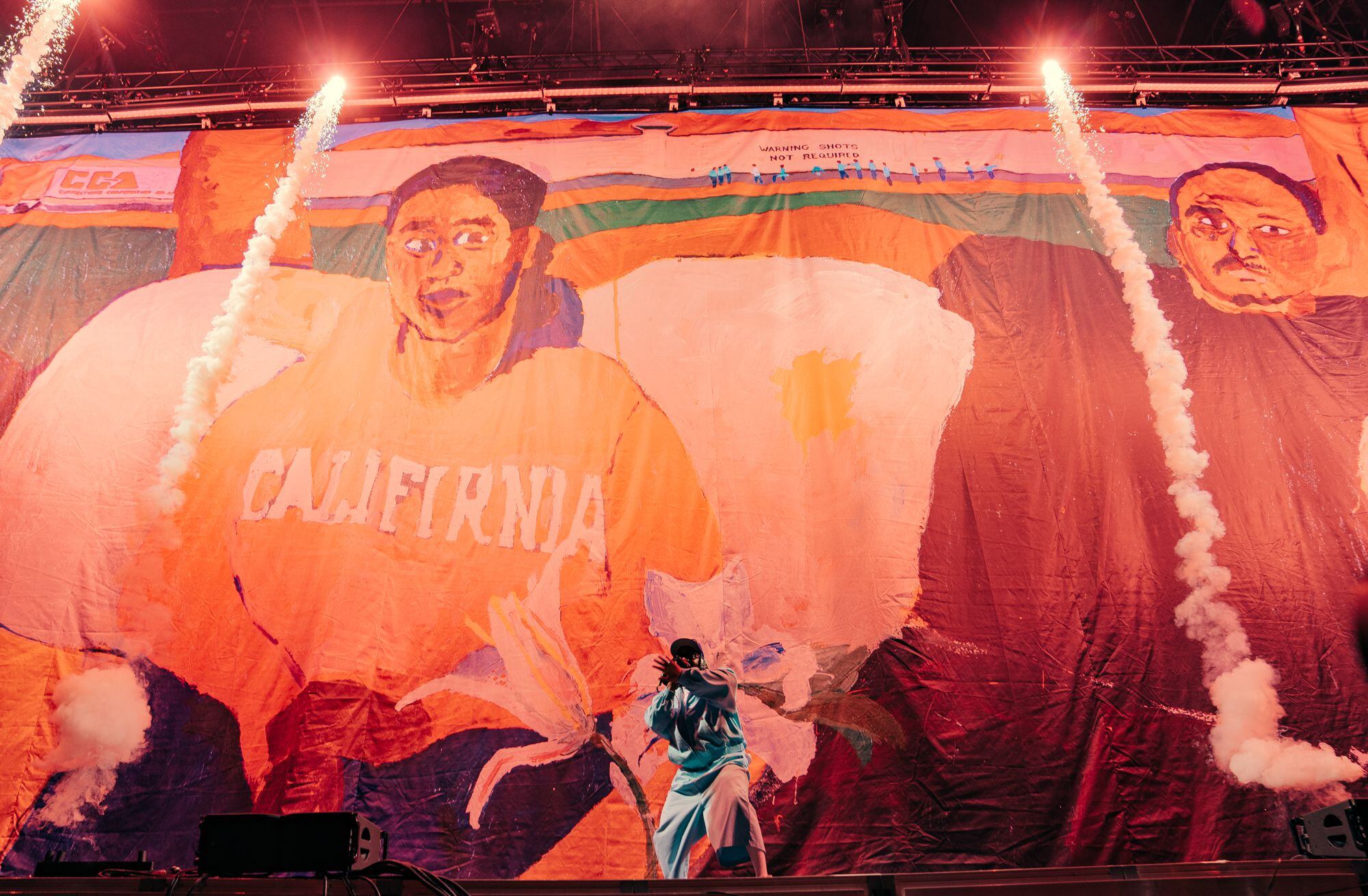Al abrirse la cortina en “N95″, comenzó a revelarse una original escenografía en capas que fueron quitándose o cambiándose. Una serie de telones reprodujeron parte de la colección de acrílicos Warning Shots Not Required del artista-activista Henry Taylor y quedaron como fondo de pantalla que dejaron en claro que Kendrick no se olvida de lo artesanal. Un recurso inteligente que amplificó polaroids de la vida negra en Estados Unidos: de manera análoga a lo facturado por su colega Donald Glover en la fundamental e insular serie Atlanta, la primera que se vio parecía una versión exagerada de un Kendrick retirado, recostado en algo que parece un sillón (o incluso un cuerpo yaciente) al lado de una mujer de hoodie rojo con la palabra “California” impresa en el pecho.