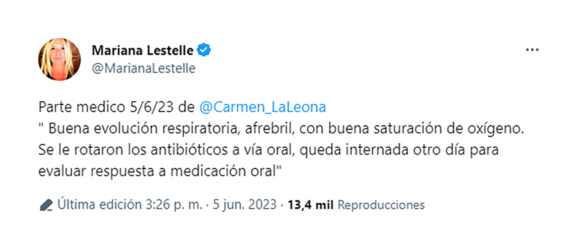 “Estuvo con un cuadro respiratorio que no mejoró en su domicilio. Al persistir con síntomas, su médico de cabecera le indicó la internación. Está bien cuidada y bien tratada. Y como el paciente y las patologías son dinámicas, hay que esperar la evolución”, comunicó Lestelle no bien comenzaron a correr las versiones que hablaban de la salud de Carmen.