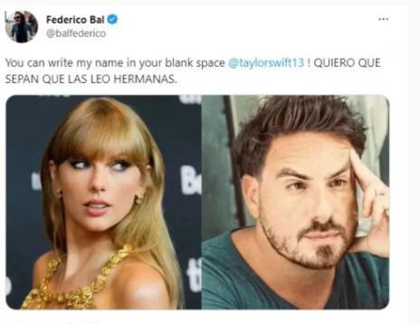 Con la expectativa por su visita, sumado a los rumores de una posible ruptura de la cantante tras seis años de noviazgo con Joe Alwyn, las fanáticas empezaron a fantasear por Twitter con qué argentino se podría vincular la artista, y entre ellos surgió el nombre de Fede Bal. El hijo de Carmen Barbieri enseguida respondió con un mensaje en el que arrobó directamente a la cantautora estadounidense. Del mismo modo, aprovechó para aprovechó confirmarles a las swifties argentinas que estaba al tanto de este desopilante hilo que se popularizó al punto de convertirse en tendencia.