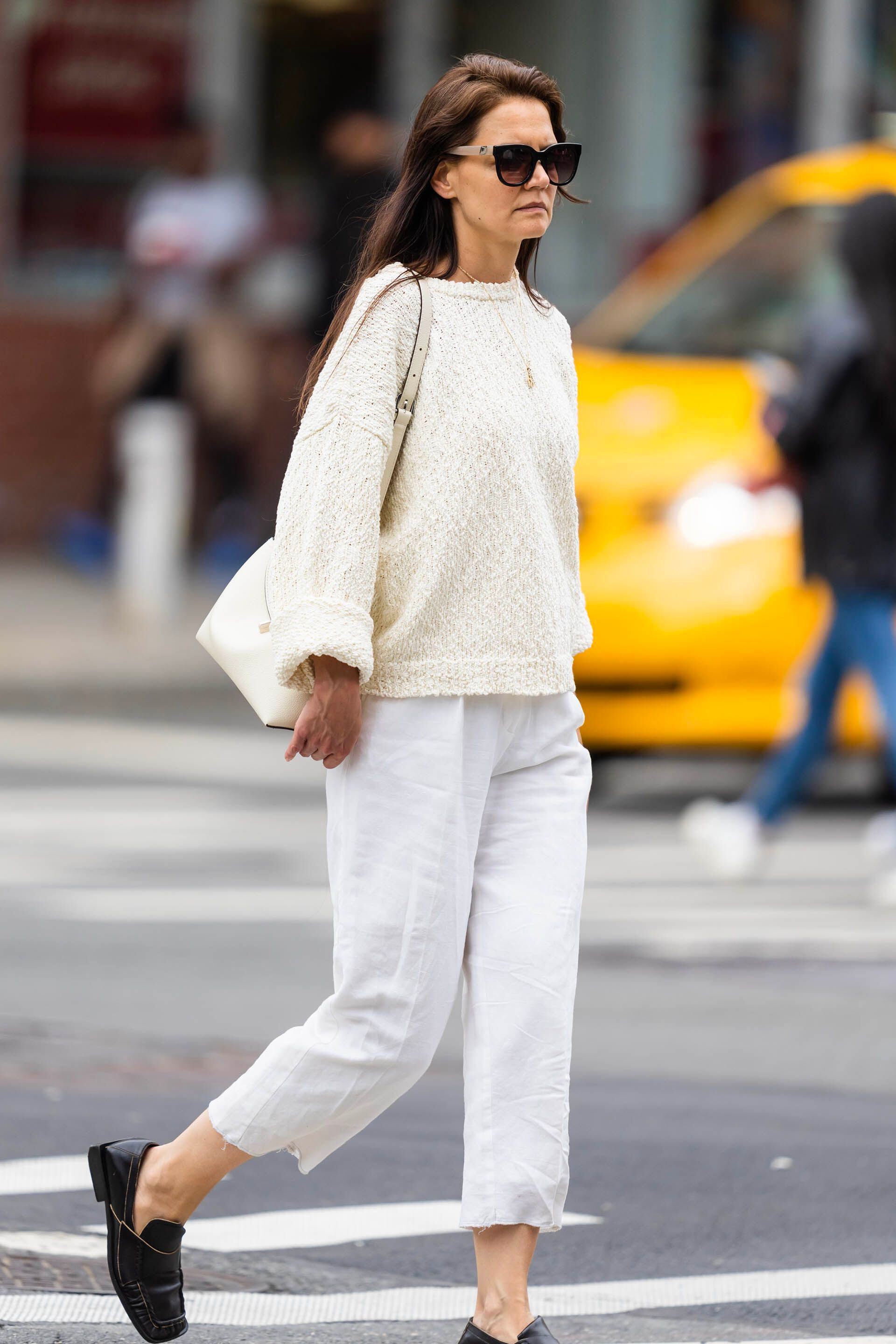 Katie Holmes fue fotografiada mientras daba un paseo por su vecindario en Nueva York. La actriz lució un look off white de sweater, pantalón capri de lino, cartera de cuero. En tanto, usó mocasines negros de cuero y llevó lentes de sol