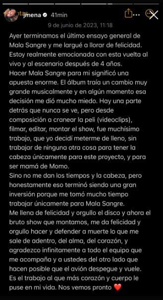 En otra publicación, en la que mostró una captura de una de sus notas, reveló qué le significó a ella trabajar en este nuevo disco. “Hacer Mala Sangre para mi significó una apuesta enorme. El álbum traía un cambio muy grande musicalmente y en algún momento, esa decisión me dio mucho miedo”, comenzó contando.