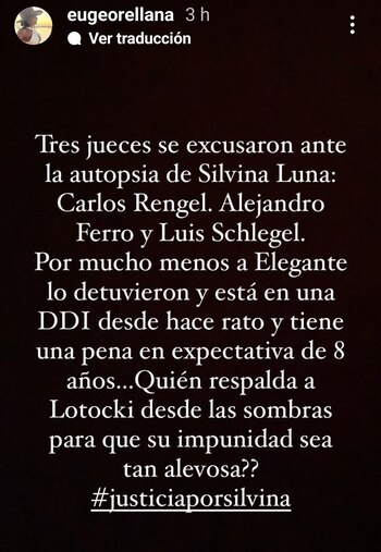“Tres jueces se excusaron ante la autopsia de Silvina Luna: Carlos Rengel, Alejandro Ferro y Luis Schlegel. Por mucho menos a L-Gante lo detuvieron y está en una DDI desde hace rato y tiene una pena en expectativa de 8 años...¿Quién respalda a Lotocki desde las sombras para que su impunidad sea tan alevosa?”, escribió la joven en una historia de Instagram junto a hastag #JusticiaporSilvina.