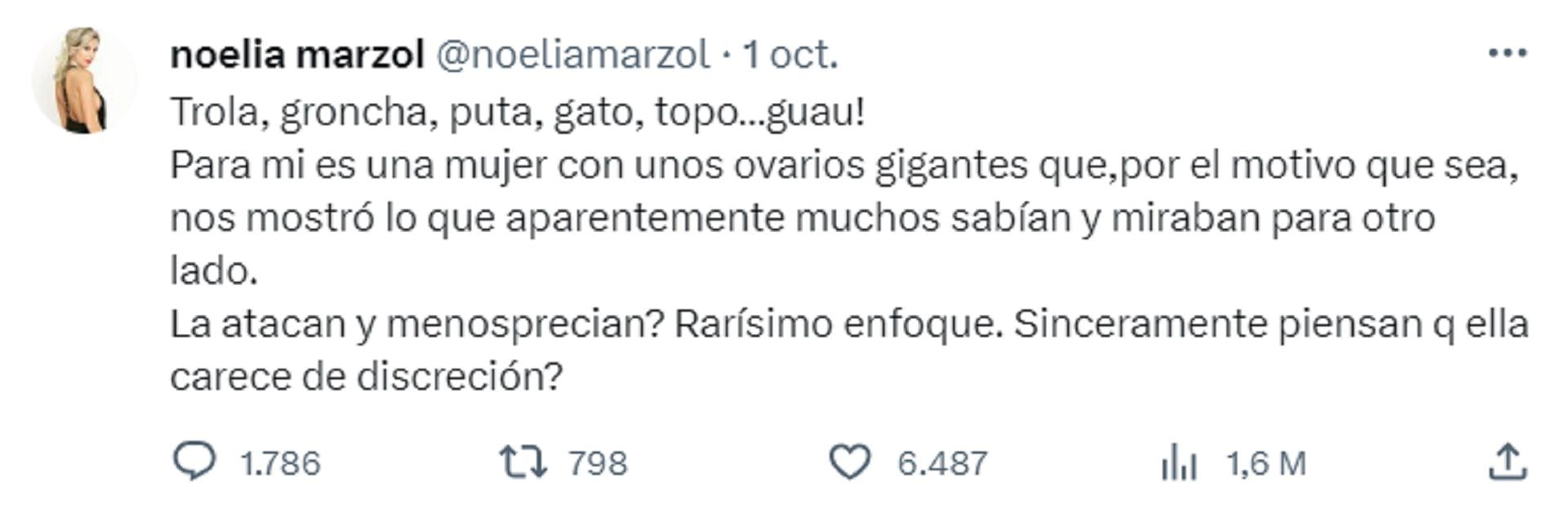 “Y si. Ovarios gigantes. Sabía lo que hacía publicándolo, lo que se generaría. Y sí, es discreta. Si eso es lo único que vinimos, lo es. Putearla a ella no cambia el asco de este señor”, agregó en otro posteo horas más tarde.