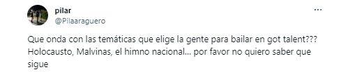 “¿Qué onda con las temáticas que elige la gente para bailar en Got Talent? Holocausto, Malvinas, el himno nacional… por favor no quiero saber qué sigue”, manifestó otra persona, indignada con los temas que eligen los participantes al momento de subirse al escenario. “¿Soy la única a la que le parece un montón el pibe que hizo homenaje a la guerra de Malvinas en got talent? Me parece desubicadísimo”, cerró otra persona.