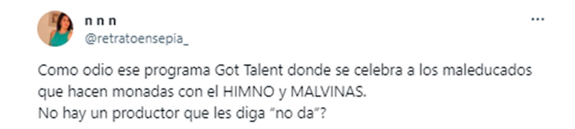 “Como odio ese programa Got Talent donde se celebra a los maleducados que hacen monadas con el Himno y Malvinas. ¿No hay un productor que les diga no da?”, se preguntó otra usuaria, muy enojada al ver la presentación de Emanuel por la televisión. “Imagínate ser el veterano de Malvinas que se planto a cuchillo contra 5 ingleses y ver que te representan así... Totalmente anti argentino el Got Talent”, opinó una televidente.