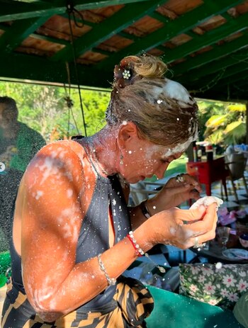 Ya entrada la tarde, el grupo se divirtió con juegos de espuma. La más entretenida fue la cumpleañera quien se encargó de rociar con burbujas de jabón a todos sus invitados, entre ellos a Mery del Cerro, mientras ella grababa el divertido momento. “Ay no”, exclamó la modelo cuando la cámara de su teléfono se oscureció por la espuma.