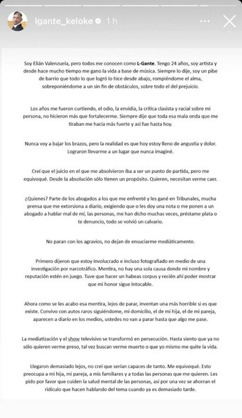 “Soy Elián Valenzuela, pero todos me conocen como L-Gante. Tengo 24 años, soy artista y desde hace mucho tiempo me gano la vida a base de música. Siempre lo dije, soy un pibe de barrio que todo lo que logró lo hice desde abajo, rompiéndome el alma, sobreponiéndome a un sinfín de obstáculos, sobre todo el del prejuicio”, comienza el mensaje, marcado por un tono de dolor y vulnerabilidad.