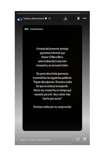 Horas más tarde, el rapero y su equipo de trabajo se manifestaron en las redes sociales para llevar tranquilidad a sus seguidores y al público en general. “A través del presente mensaje queremos informar que Homer El Mero Mero está recibiendo la atención necesaria y se encuentra bien”, comienza el breve comunicado publicado por el sello discográfico Nocita Music.