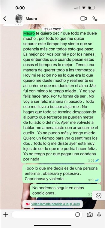 “No hagas que todo se termine desgastando al punto que terceros se puedan meter de tu lado o del mío. Ayer me volviste a hablar, me amenazaste con arrancarme el cuello. Yo no puedo más y tengo miedo”, insiste ella. “Quiero un tiempo para ver qué sentimos los dos. Todo lo que me dijiste ayer está muy lejos de ser lo que me podría hacer feliz. Yo no tengo por qué pagar una condena por nada. Todo lo que me decís es de una persona enferma, obsesiva y posesiva. Caprichosa y violenta. No podemos seguir en estas condiciones”, cierra Wanda.