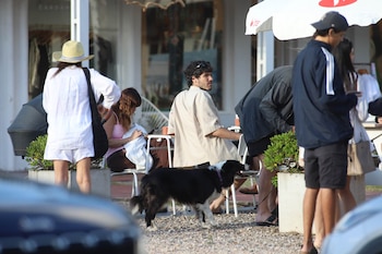 En el caso de Desrets las ojotas fueron el calzado seleccionado para tomar un café con su pareja. Combinados con unas bermudas de color negro, una musculosa de color blanco con una camisa manga corta de color arena y unos anteojos de sol negros.