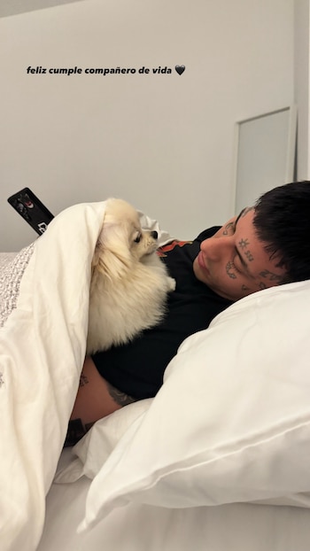 Duki celebró hoy su cumpleaños número 29 envuelto en muestras de cariño en las redes sociales. Pero uno de esos posteos voló más alto que el resto. Fue el que publicó su novia, Emilia Mernes. La joven cantante entrerriana, un año menor que el trapero, subió una foto a sus historias de Instagram donde le dedicó un tierno mensaje: “feliz cumple compañero de vida”, acompañado de un corazón negro. La imagen muestra a Duki relajado en la cama con Roma, la mini pomerania que comparten.