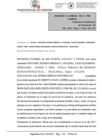 El reciente fallo del Juzgado Civil, Comercial y de Familia de 3ª Nominación de Río Cuarto ha generado un intenso debate sobre los límites de la libertad de expresión en el entorno digital y la protección del honor personal. En una resolución dictada el 24 de septiembre de 2025, la jueza Selene Carolina Ivana López condenó a Tania Elizabeth Aguilera a indemnizar a Esteban Hernán Ontivero, más conocido como “El Negro Onty”, ex participante de Gran Hermano, con $1.828.000 por daño moral y psicológico, además de ordenar la publicación de la sentencia como reparación específica.