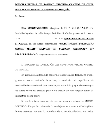 Elba Marcovecchio, abogada de Mauro Icardi, presentó un escrito ante la justicia argentina solicitando que las hijas del futbolista y Wanda Nara permanezcan con su padre entre el 22 y el 27 de diciembre de 2025 y pasen la fiesta de Navidad con él, y que se autorice el regreso de Icardi a Turquía luego de ese período. El pedido se enmarca en negociaciones y antecedentes de conflicto por la organización de las fiestas de fin de año, un tema que ha generado amplia repercusión mediática y social.